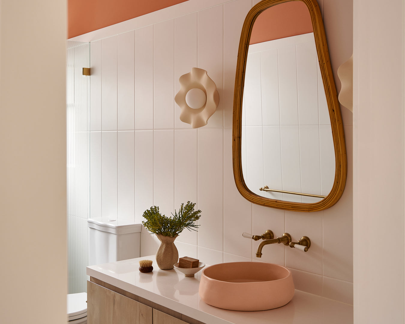 Bathrooms were the perfect place for colour to really sing and this project features Nood Co. basins across multiple spaces, each chosen to amplify the home’s joyful palette.