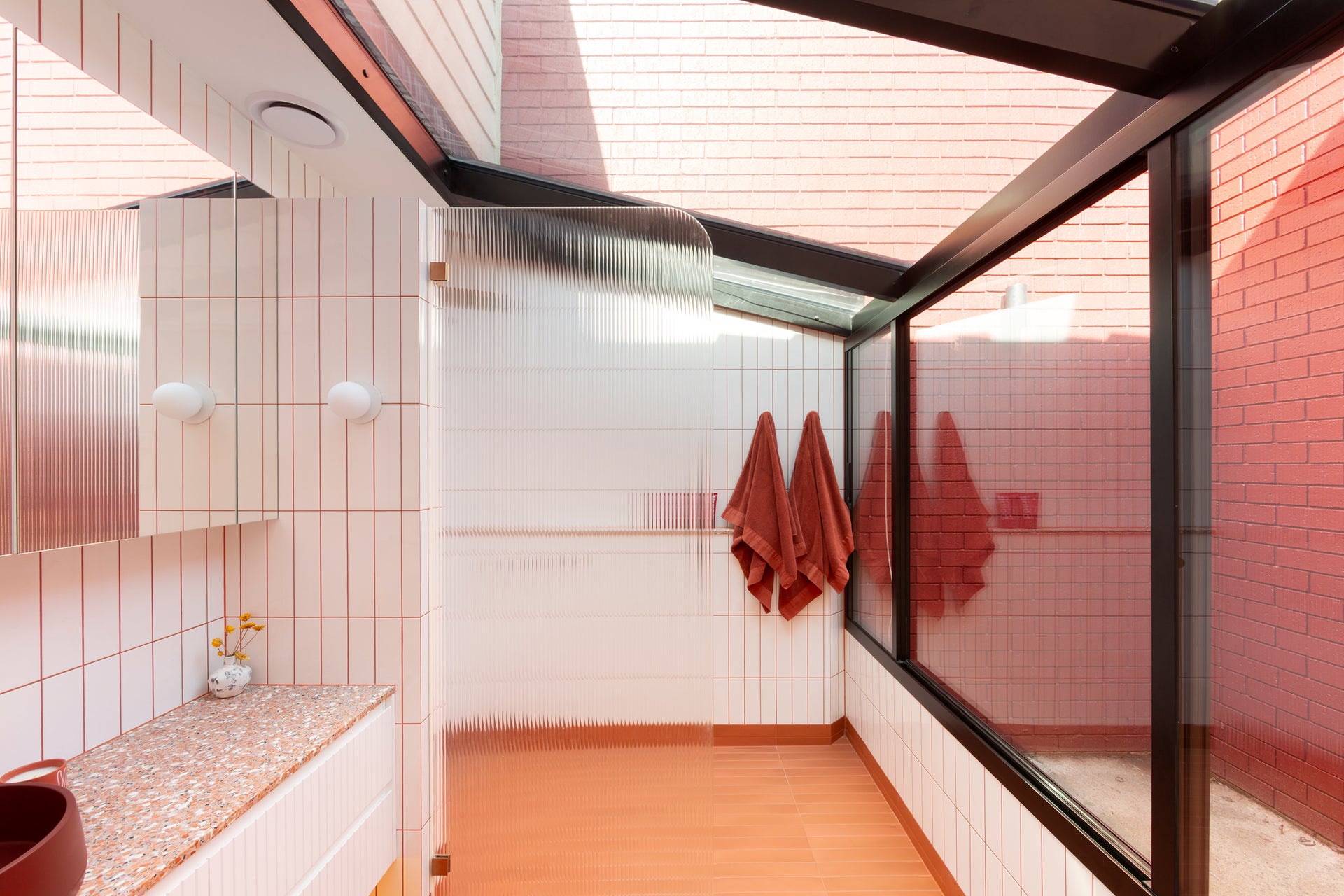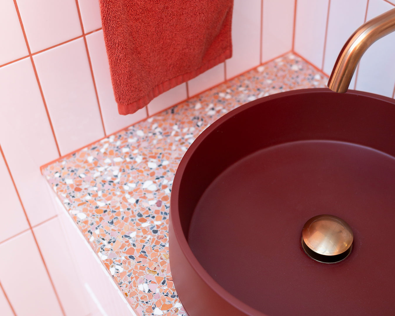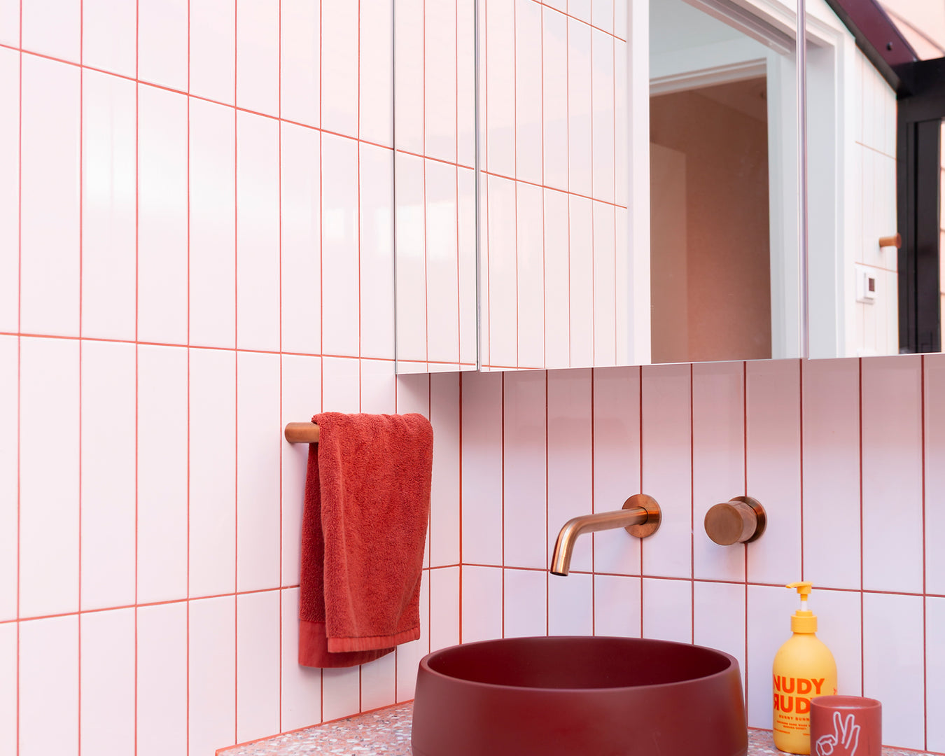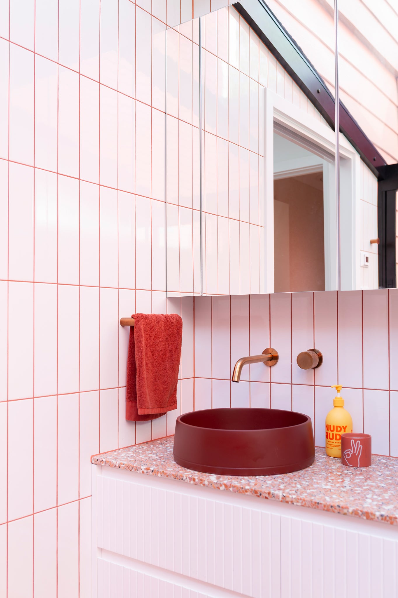 Collaborative workshops with the clients’ guided material and product selections, featuring bold colour choices that defined the palette. Terrazzo surfaces, terracotta tones, copper accents, textured tiles, and fluted glass were layered to create visual richness while staying practical. Sculptural Funl basins in Clay and Blush Pink from Nood Co. were integrated early in the process, reinforcing a cohesive and confident colour story throughout the home.