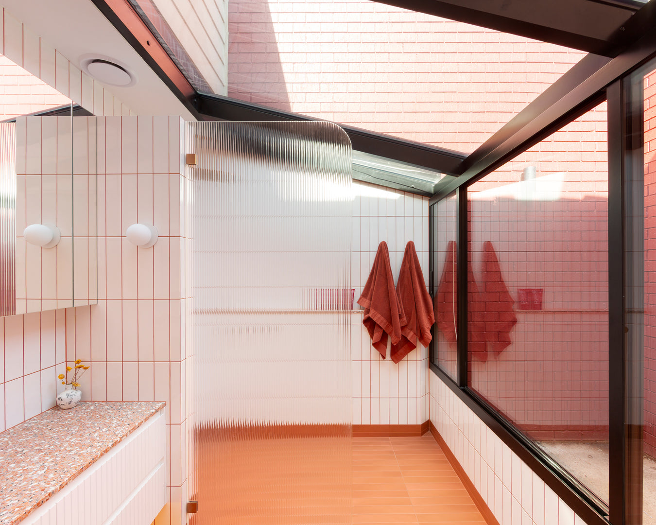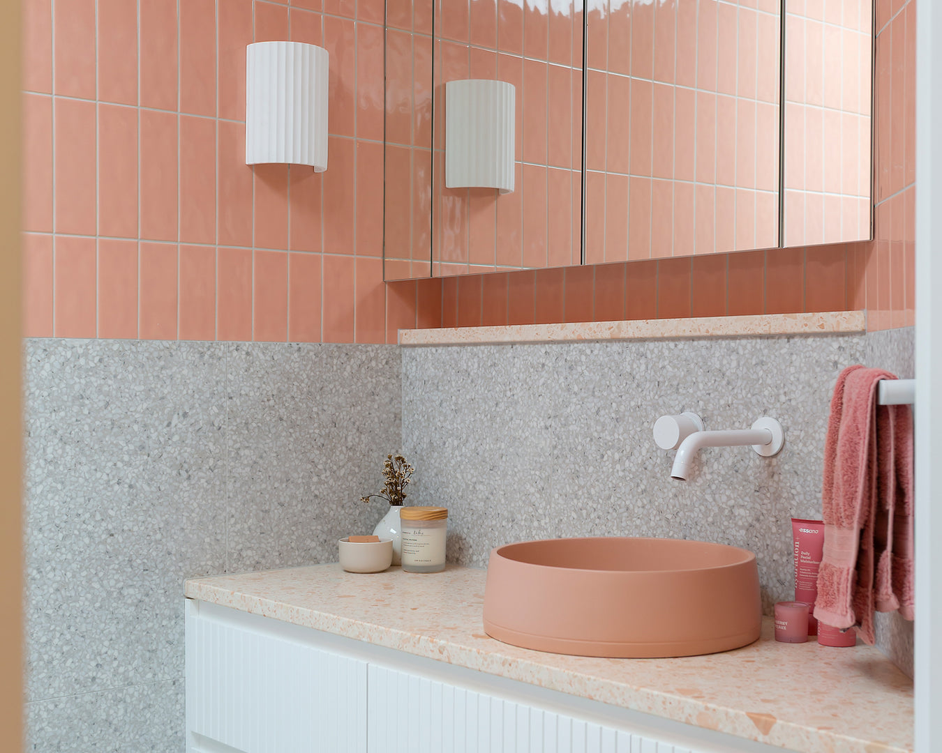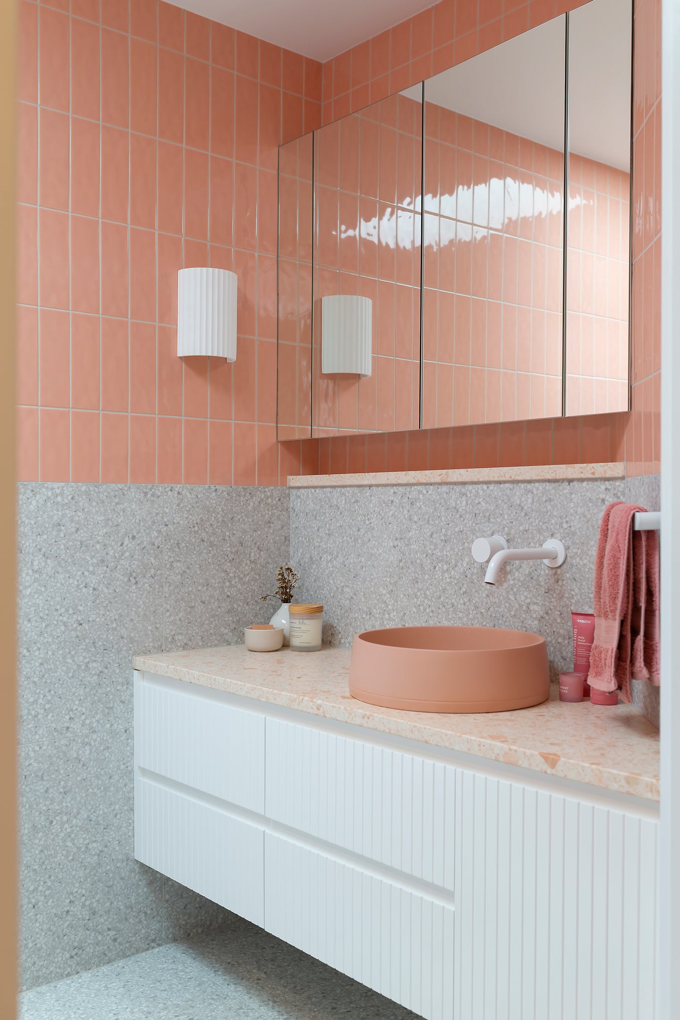 Collaborative workshops with the clients’ guided material and product selections, featuring bold colour choices that defined the palette. Terrazzo surfaces, terracotta tones, copper accents, textured tiles, and fluted glass were layered to create visual richness while staying practical. Sculptural Funl basins in Clay and Blush Pink from Nood Co. were integrated early in the process, reinforcing a cohesive and confident colour story throughout the home.