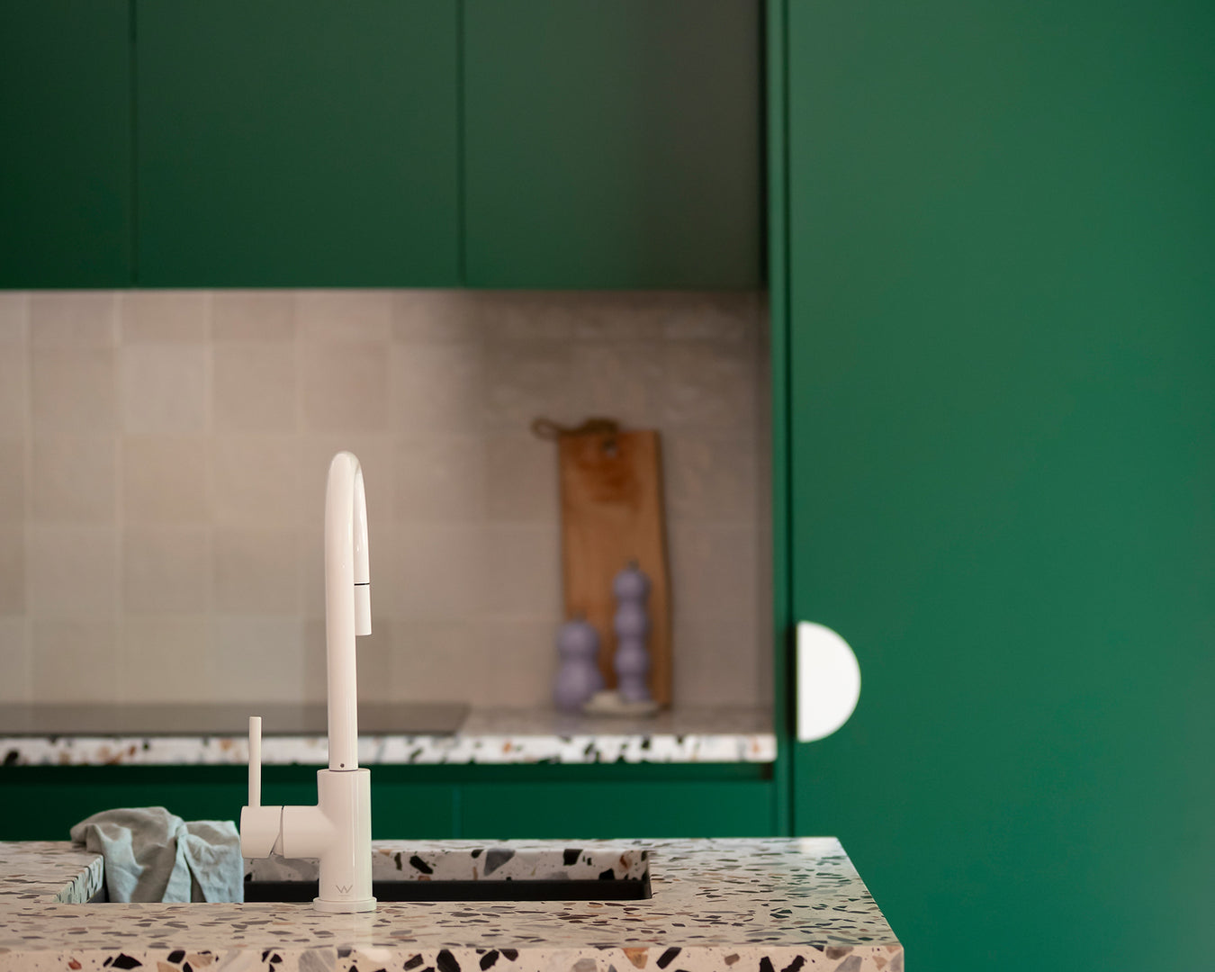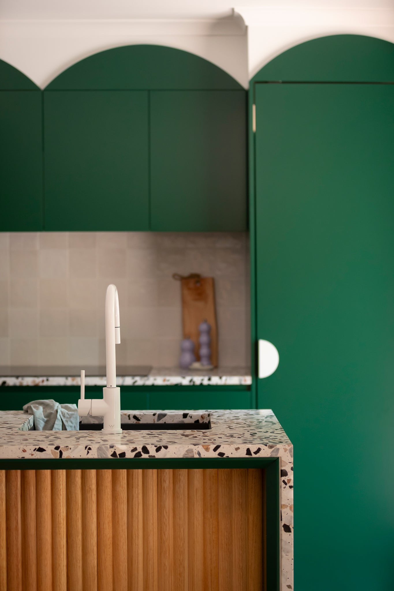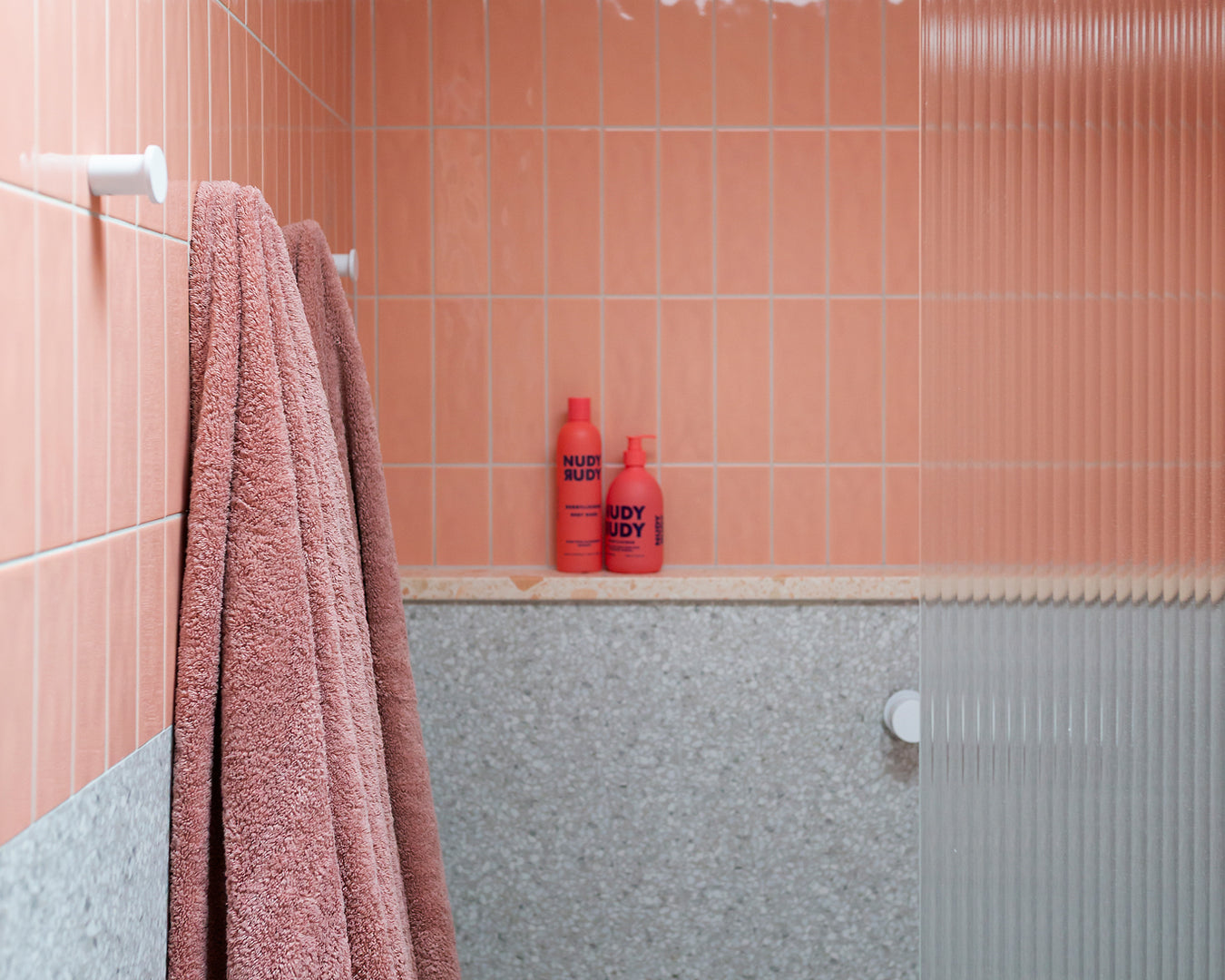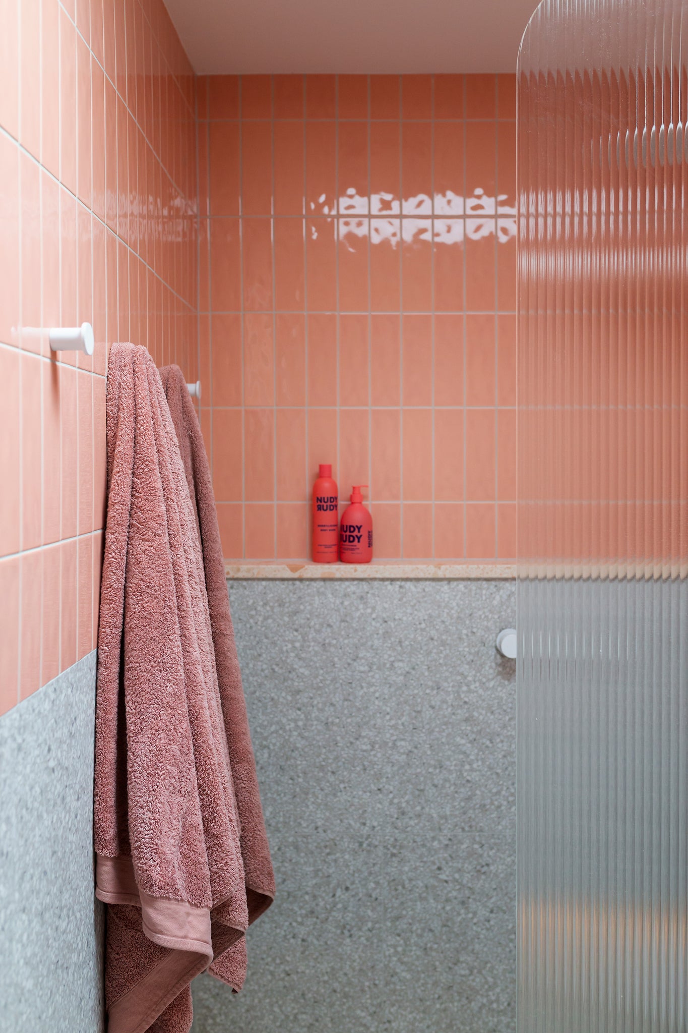 Collaborative workshops with the clients’ guided material and product selections, featuring bold colour choices that defined the palette. Terrazzo surfaces, terracotta tones, copper accents, textured tiles, and fluted glass were layered to create visual richness while staying practical. Sculptural Funl basins in Clay and Blush Pink from Nood Co. were integrated early in the process, reinforcing a cohesive and confident colour story throughout the home.