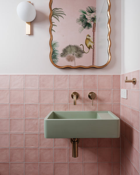 Glen Iris ensuite featuring Nood Co. Pill Basin in Blush Pink with exposed brick and blush tile splashback.