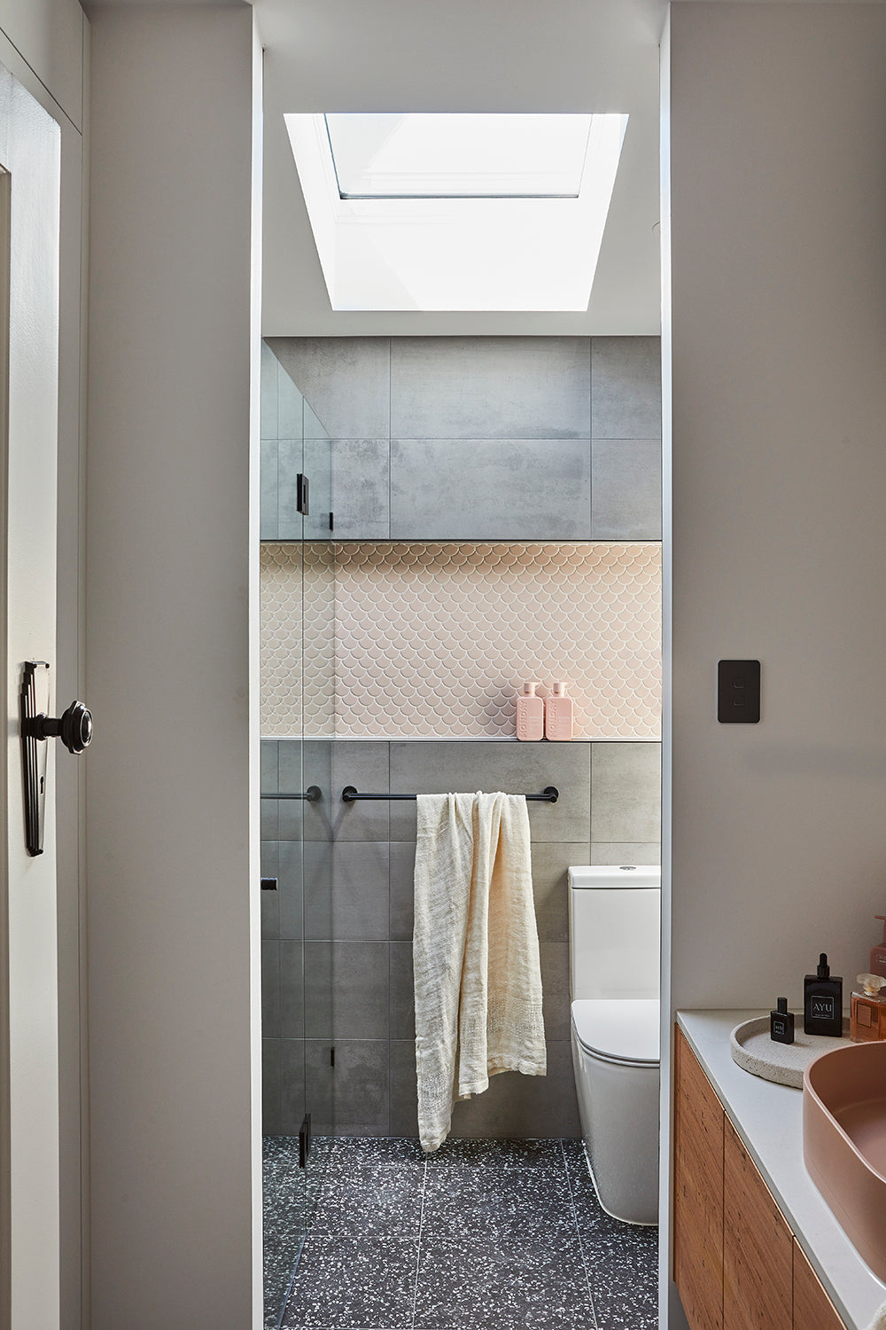 This ensuite showcases the power of tonal balance. The Nood Co. Pill Basin in Blush Pink sits proudly atop a white benchtop and custom timber vanity, framed by blush fish scale tiles that reappear within the shower niche. A skylight above washes the space in soft natural light, accentuating the layered materiality.
