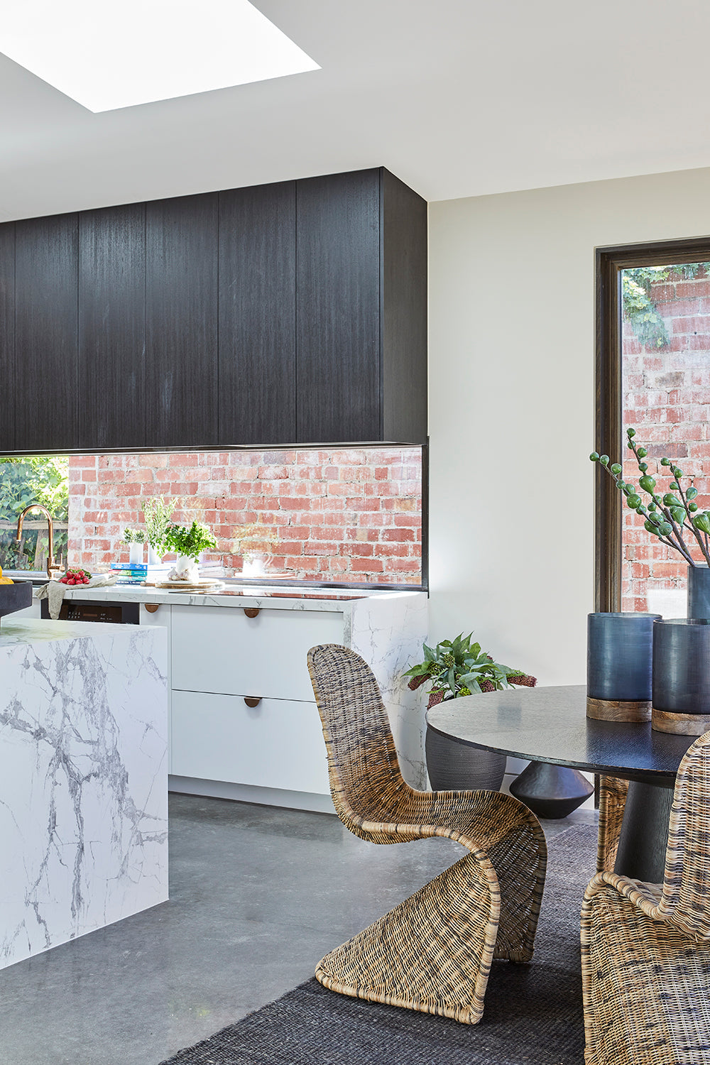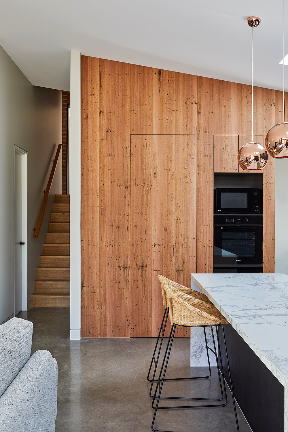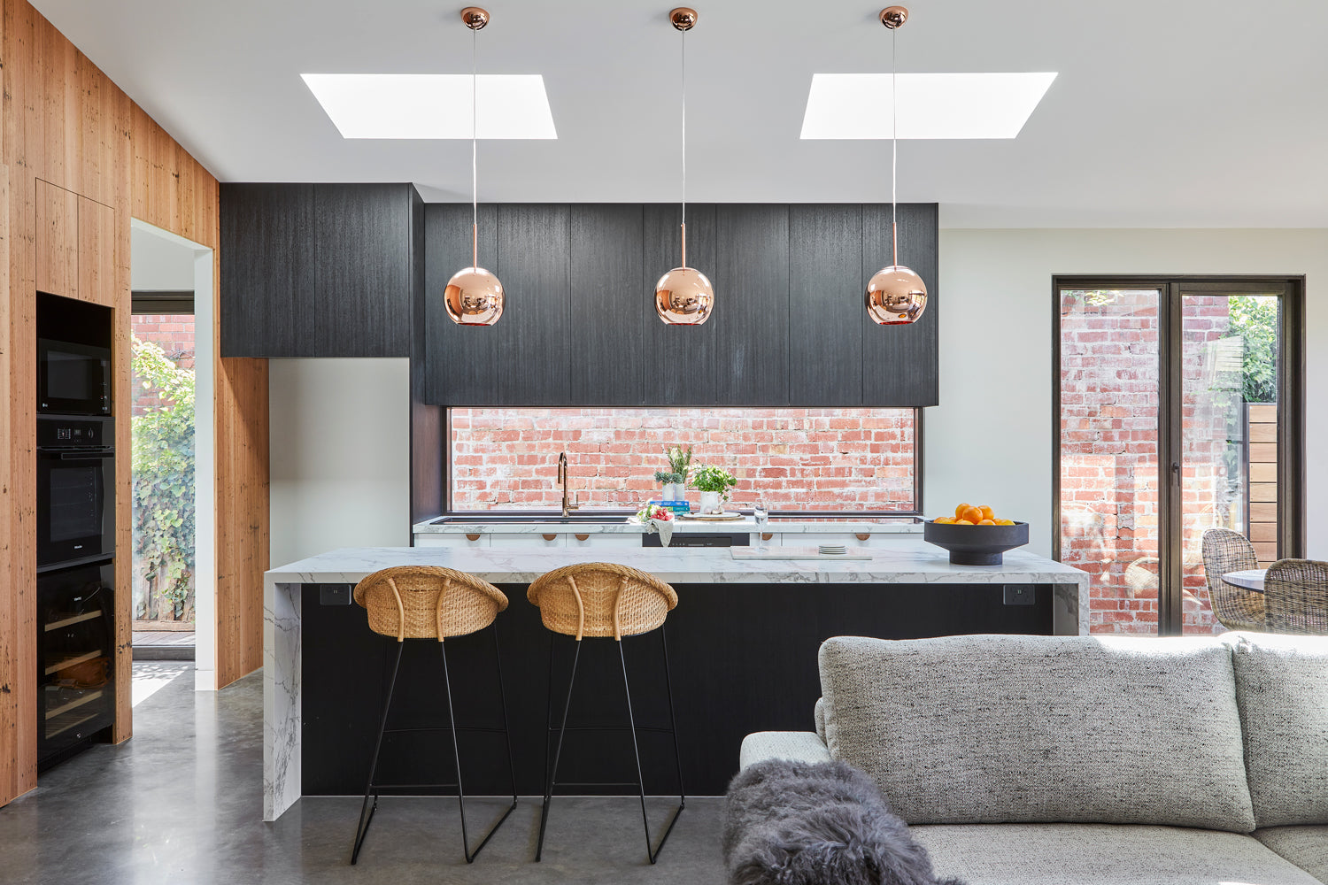 In the heart of Glen Iris, a refined architectural extension anchors a family home and entertainer’s delight through an elegant play of light, material, and proportion. A robust polished concrete floor establishes a visual and physical foundation, while custom Tasmanian oak joinery and matte black veneer elements bring warmth and rhythm to the open-plan kitchen and mudroom zone. Natural light is harnessed and diffused throughout the home, making the spaces feel airy and effortlessly spacious.