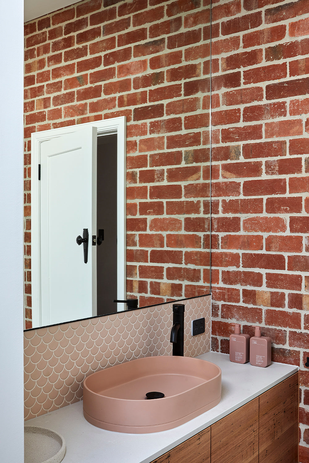 A striking red brick wall - a nod to the home’s original structure - lends depth and history, creating contrast against the pastel palette. Matte black tapware and fittings provide cohesion and a subtle contemporary edge, rounding out a bathroom that feels serene, tactile, and timeless.