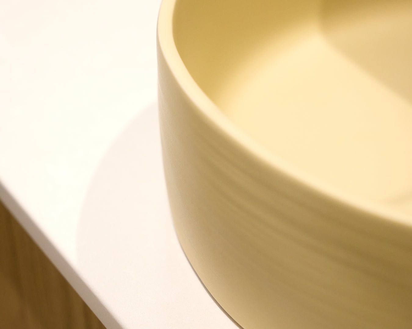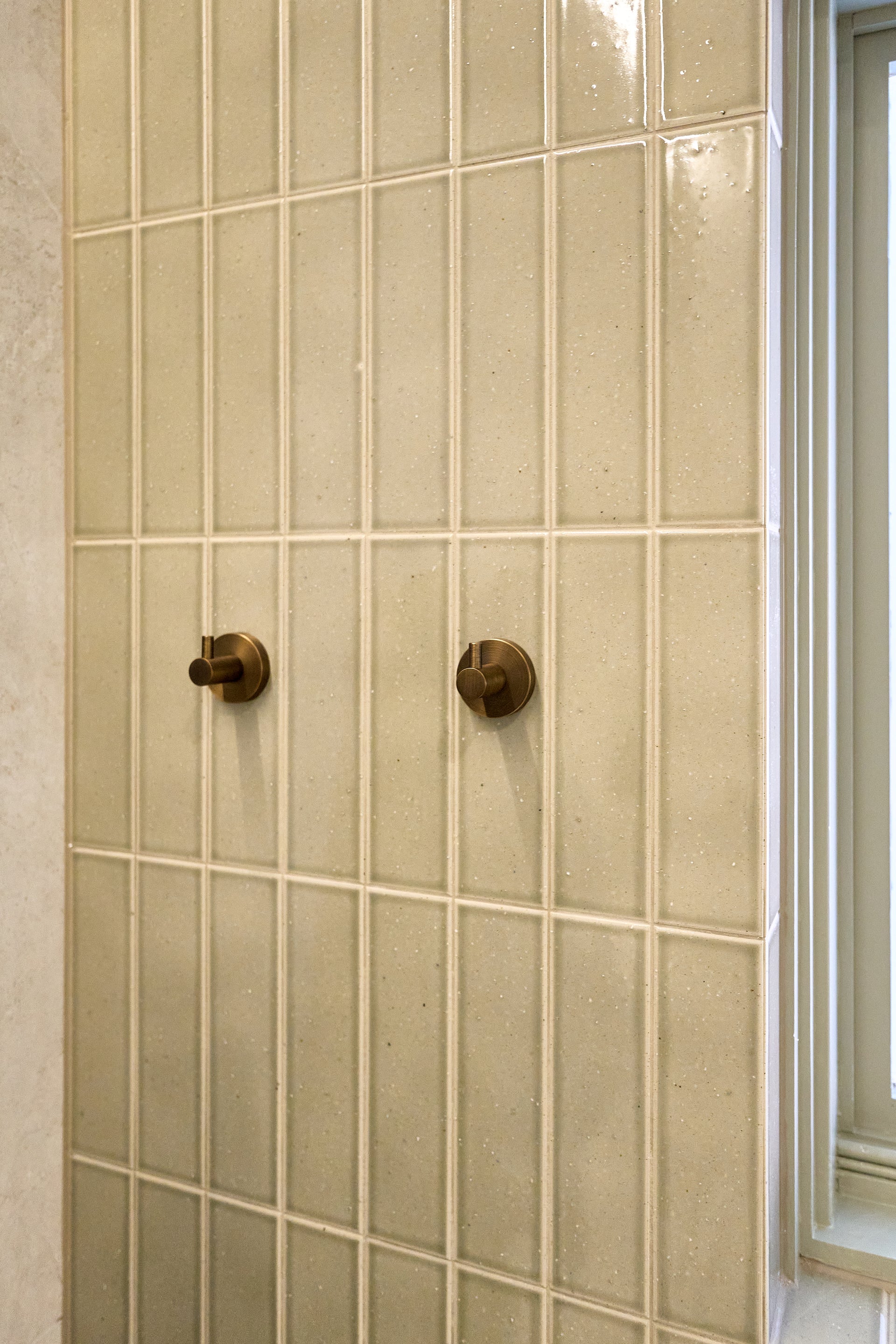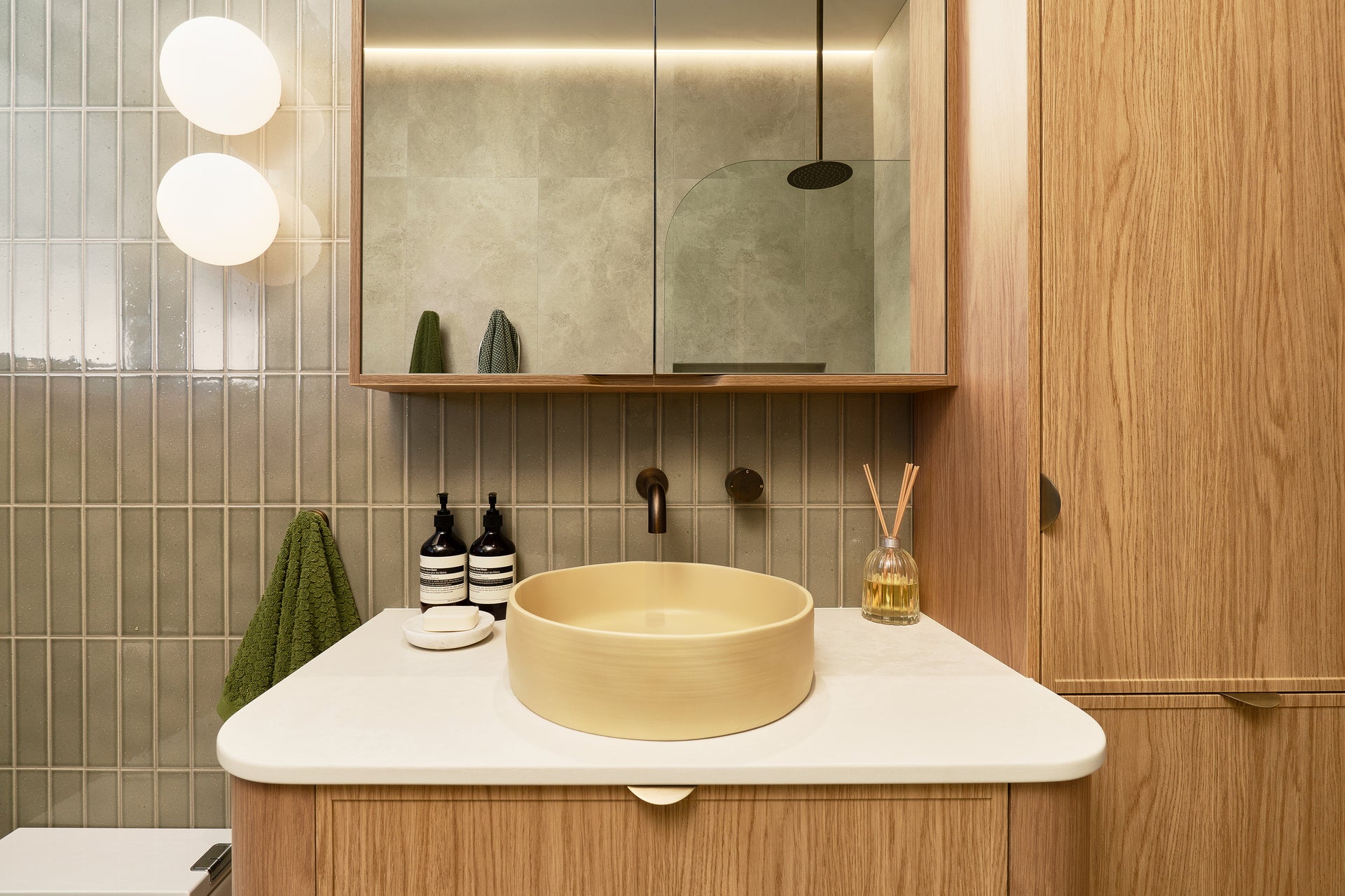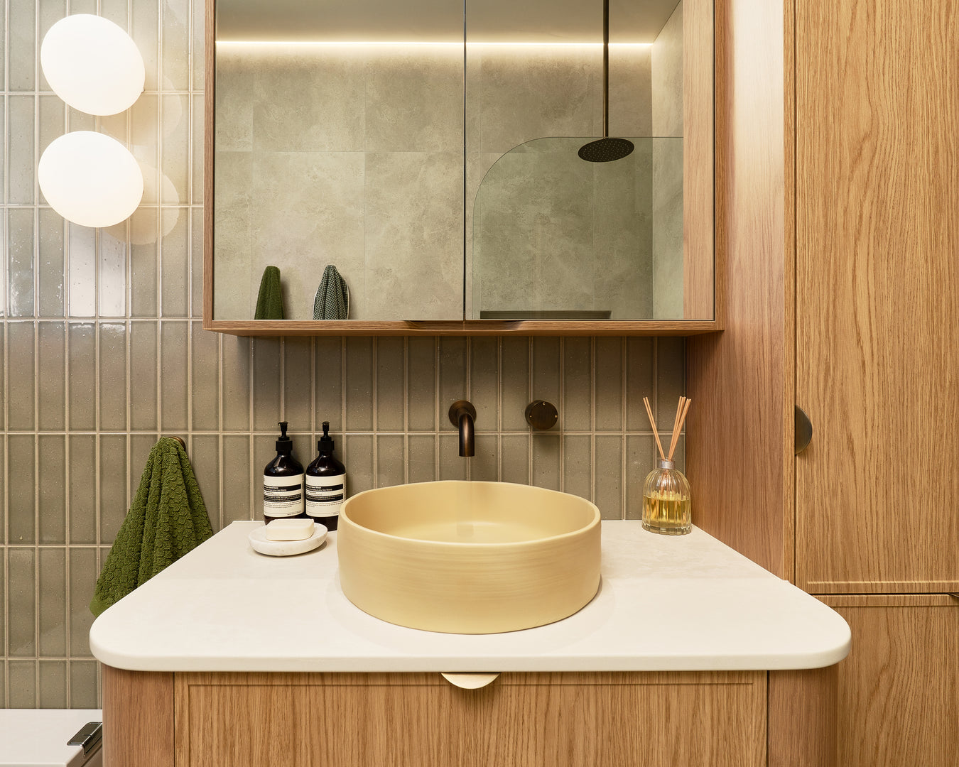 Designer Cat Cossettini describes her vision as a balance between heritage charm and modern restraint. Soft olive tones, warm neutrals, and textured surfaces create harmony, complemented by the Nood Co Slip Basin in Sand. “The Slip Basin’s subtle undulations and handcrafted concrete texture bring warmth and individuality to the space, while the sand hue complements the tile and brass finishes beautifully.”