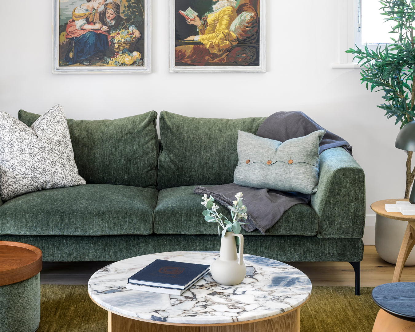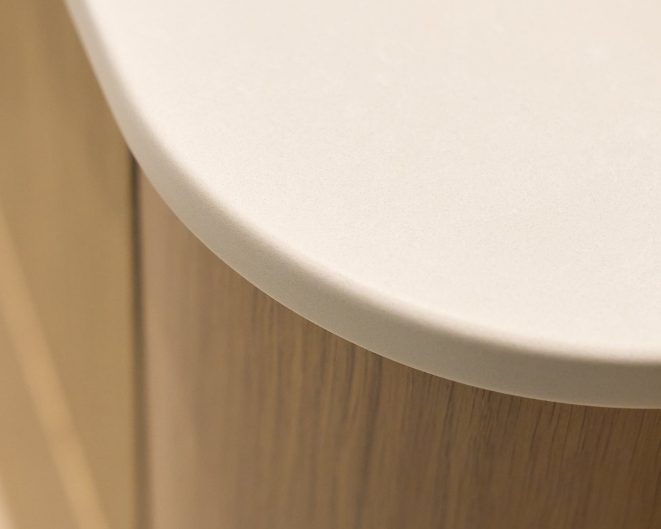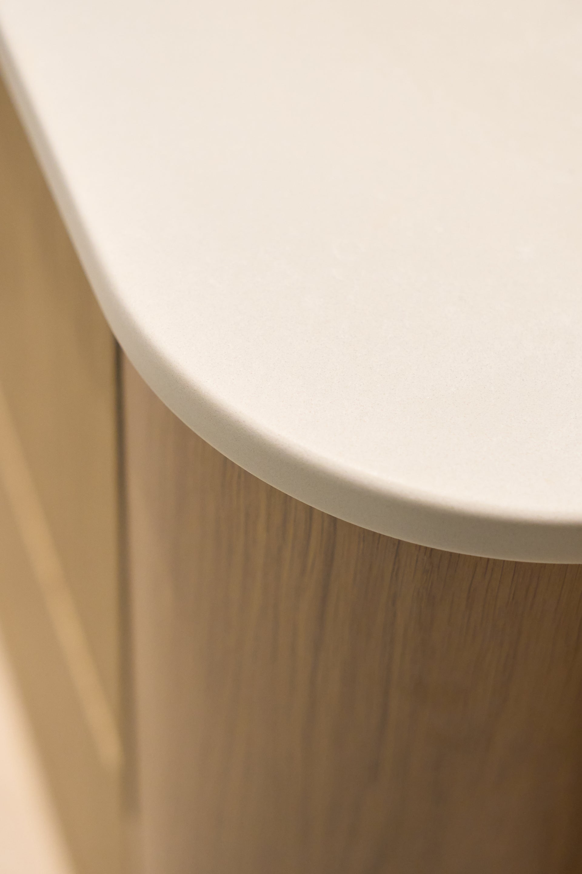 Designer Cat Cossettini describes her vision as a balance between heritage charm and modern restraint. Soft olive tones, warm neutrals, and textured surfaces create harmony, complemented by the Nood Co Slip Basin in Sand. “The Slip Basin’s subtle undulations and handcrafted concrete texture bring warmth and individuality to the space, while the sand hue complements the tile and brass finishes beautifully.”