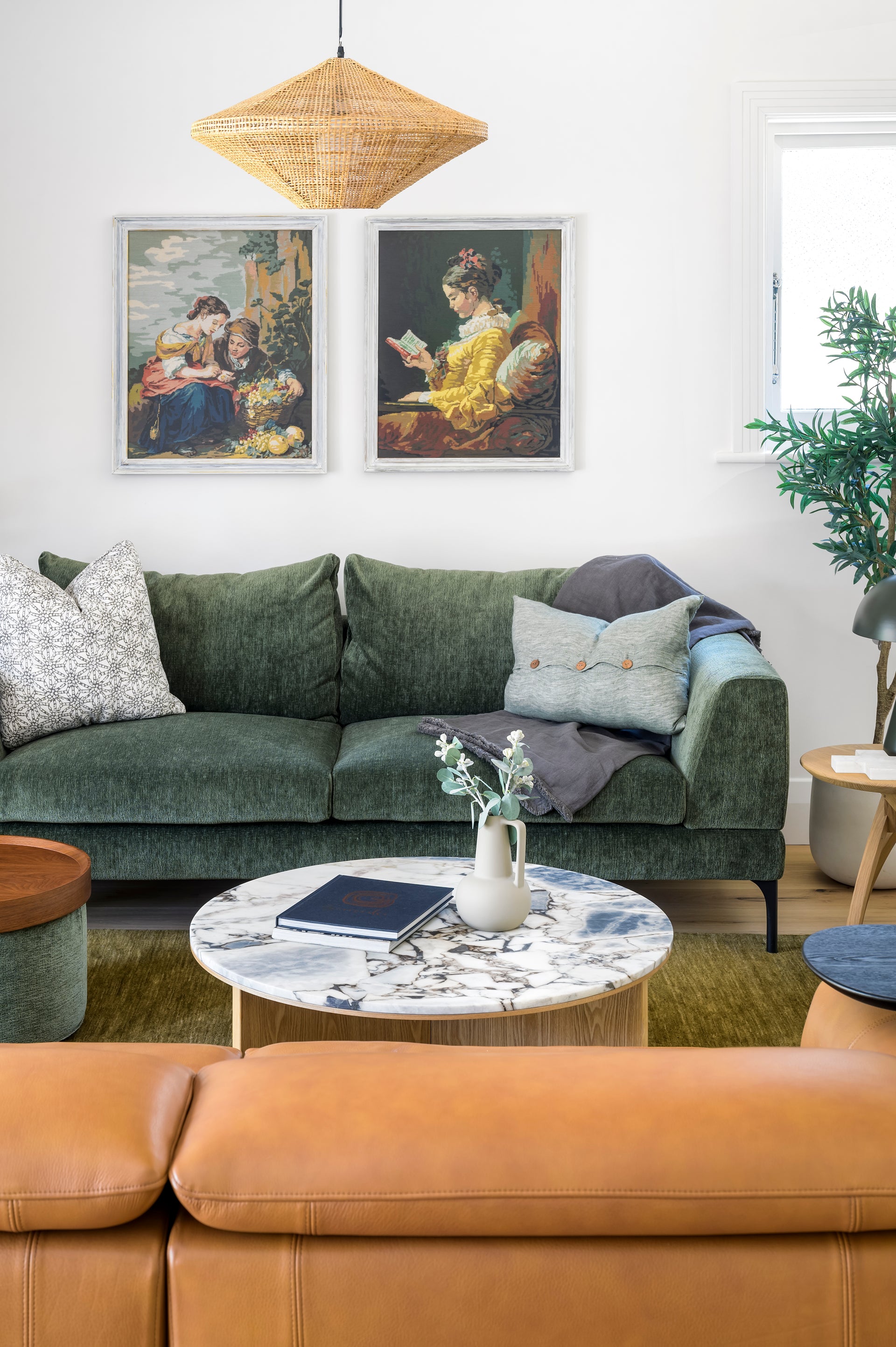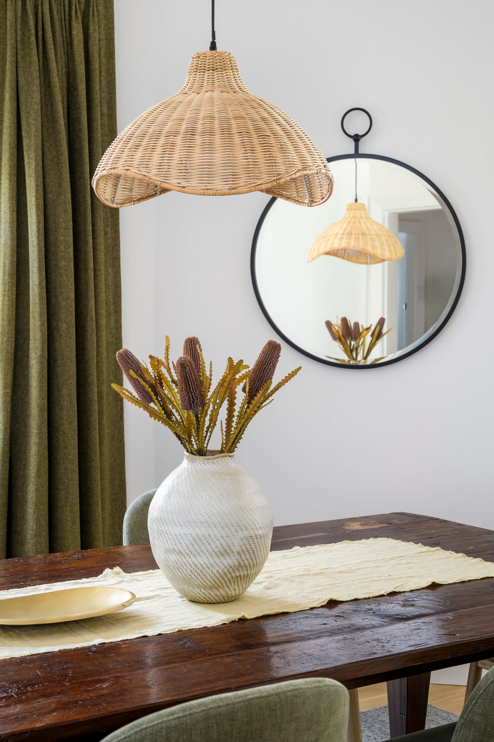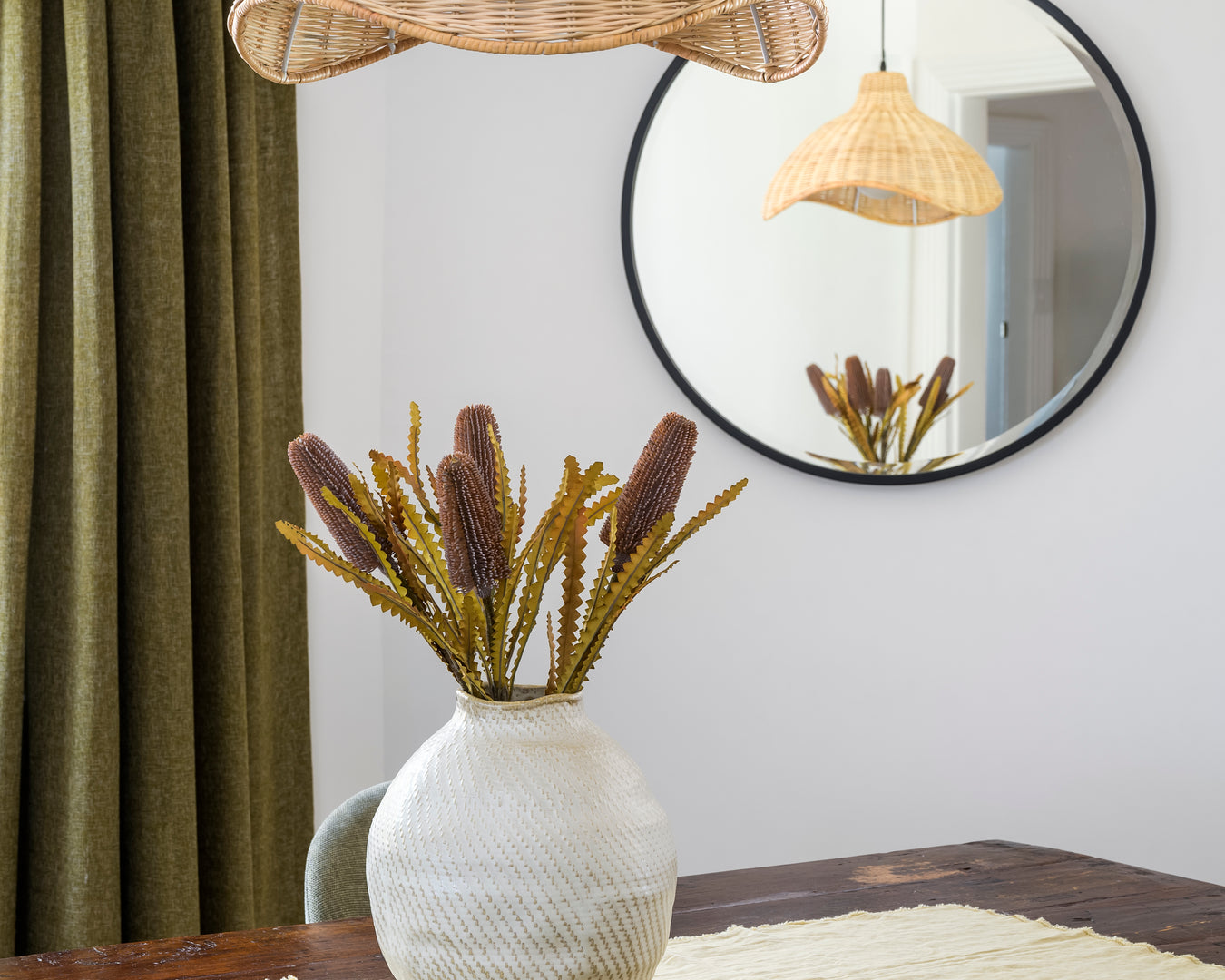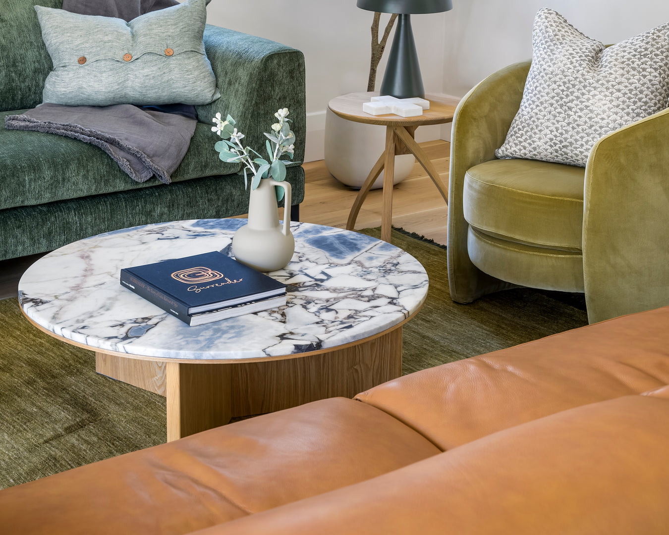 Designer Cat Cossettini describes her vision as a balance between heritage charm and modern restraint. Soft olive tones, warm neutrals, and textured surfaces create harmony, complemented by the Nood Co Slip Basin in Sand. “The Slip Basin’s subtle undulations and handcrafted concrete texture bring warmth and individuality to the space, while the sand hue complements the tile and brass finishes beautifully.”