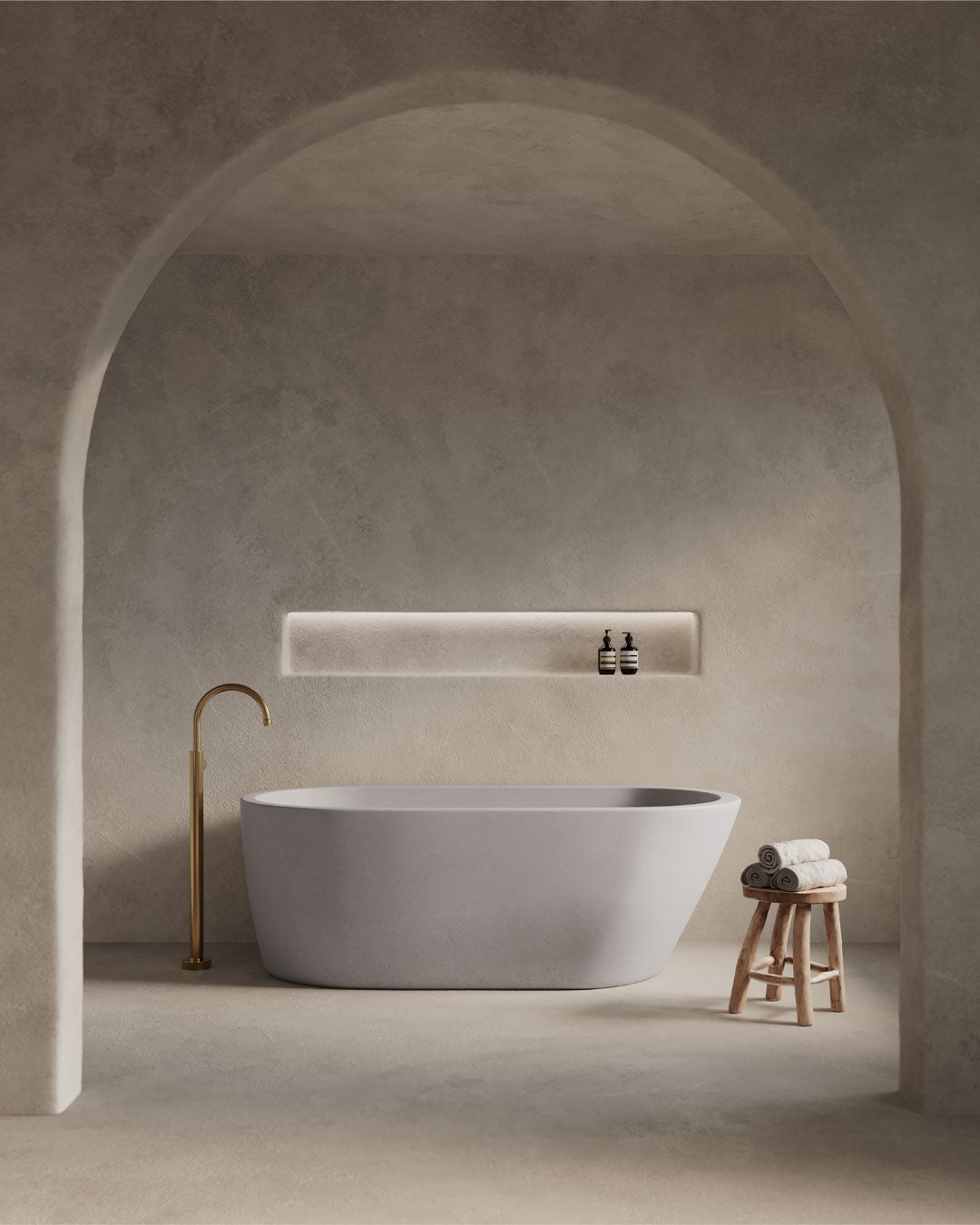 Kindly Note: The images provided are for illustrative purposes and may not accurately capture the product's true colour. For a precise colour match, we recommend referencing our sample kits or viewing our products in person at an authorised reseller. Our concrete mix yields a predominantly smooth finish. While pinholes can occasionally appear, the overall appearance and patina of your bath will remain largely uniform.